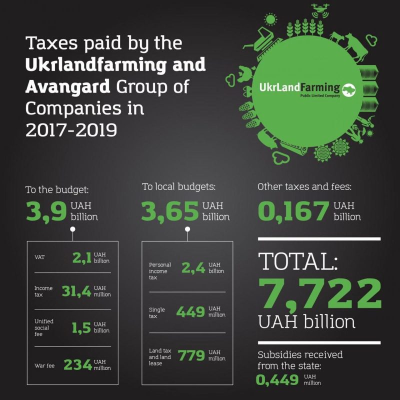 During 2017-2019, UkrLandFarming and Avangard Group of Companies paid UAH 7.722 billion to the country's consolidated budget; of this amount, UAH 3.9 billion (US$158.2 million) was transferred to the national budget alone, the press service of one of the country's largest agri-holdings said in a statement on its official website, according to the Ukrainian News Agency.