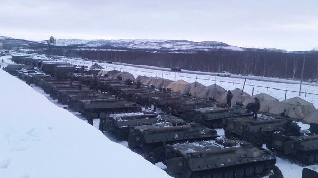 On Kondrashov's photo, a number of units of military equipment from the 200th Brigade are in a village called "19th Kilometer," near Pechenga, where the unit is located. Dozens of vehicles have the yellow identifying triangles and hull numbers on the front side of the chassis. Also in this photograph is a MT-LB BMK with its "relatives" that is not adorned with white numbers and tactical signs.