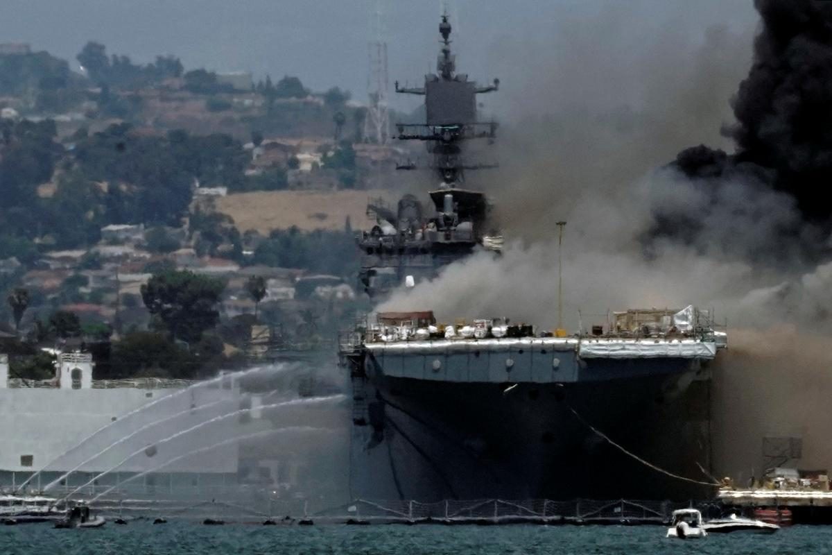 An amphibious assault ship caught fire on Sunday at Naval Base San Diego, resulting in an on-board explosion that injured 21 people and filled the skies with dark smoke, according to officials.